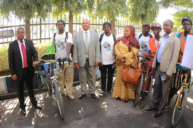 | Wapanda baiskeli kutokea Mbeya wakiwa katika picha ya pamoja na mkuu wa mkoa wa Dar es salaam Said Sadick na baadhi ya viongozi wa mkoa huo |